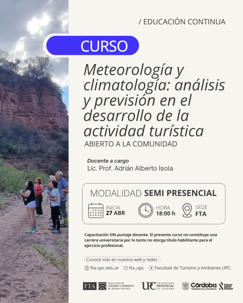 La Secretaría de Extensión de la Facultad de Turismo y Ambiente invita a participar de la capacitación “Meteorología y climatología: análisis y previsión en el desarrollo de la actividad turística” La meteorología y la climatología son fundamentales para el turismo, ya que las condiciones climáticas influyen directamente en la experiencia del turista y en la planificación de actividades. Este curso busca proporcionar a los estudiantes de turismo una base teórica sólida en meteorología y climatología, permitiéndoles comprender cómo el clima afecta diversos aspectos del turismo, desde la elección de destinos hasta la gestión de riesgos.