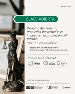 La cátedra de Derecho del Turismo del CCC Licenciatura en Turismo y la Secretaría de Extensión y Vinculación Territorial de la Facultad de Turismo y Ambiente invitan a participar del Ciclo de Clases Abiertas “Derecho del Turismo», organizado por el equipo de la cátedra de Derecho del Turismo del CCC Licenciatura en Turismo.
